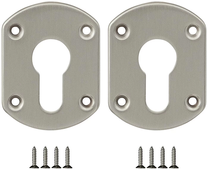 Комплект декоративных накладок Fuaro ESC031 под цилиндровый механизм. Комплект состоит из двух накладок. Накладки предназначены для установки на цилиндровый механизм для декорирования замочной скважины. Материал изготовления: сталь. Тип крепления накладок: сквозной. Цвет: матовый никель. Саморезы в цвет накладок.